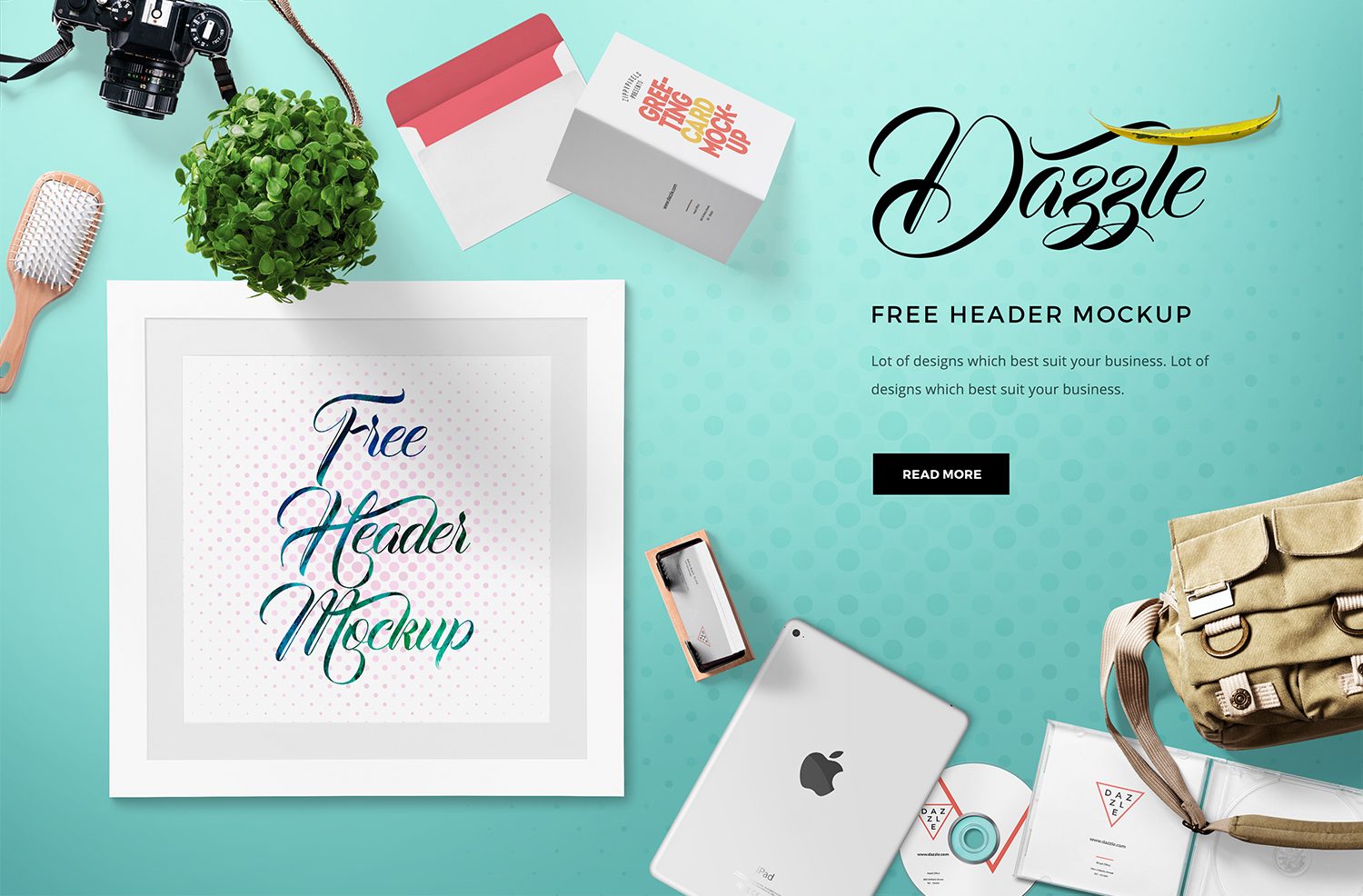 Customizable free hero header mockup with moveable objects and editable text. This free mockup offers a variety of items like a camera, plant, hair-brush, greeting card, picture frame, business card, iPad, CD, CD cover and bag. All of the items in this mockup scene are moveable and are placed in separate folders so you can arrange them or simply remove any of the items to make new compositions of your own requirements. You can also replace the text with your own one. Just use a smart object option to add your own artwork in this mockup. Moreover, its well-organized layers allow you to edit the shadows, light effects, and many other things. Download this free mockup now and share your experience in the comments box below.