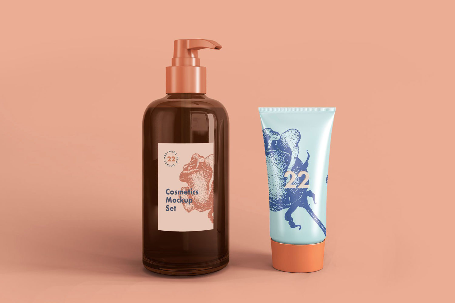 Free soap dispenser & cream tube cosmetic mockup showcase your branding packaging design with a realistic look. Very simple edit with smart objects. This mockup is free for both personal and commercial purposes.