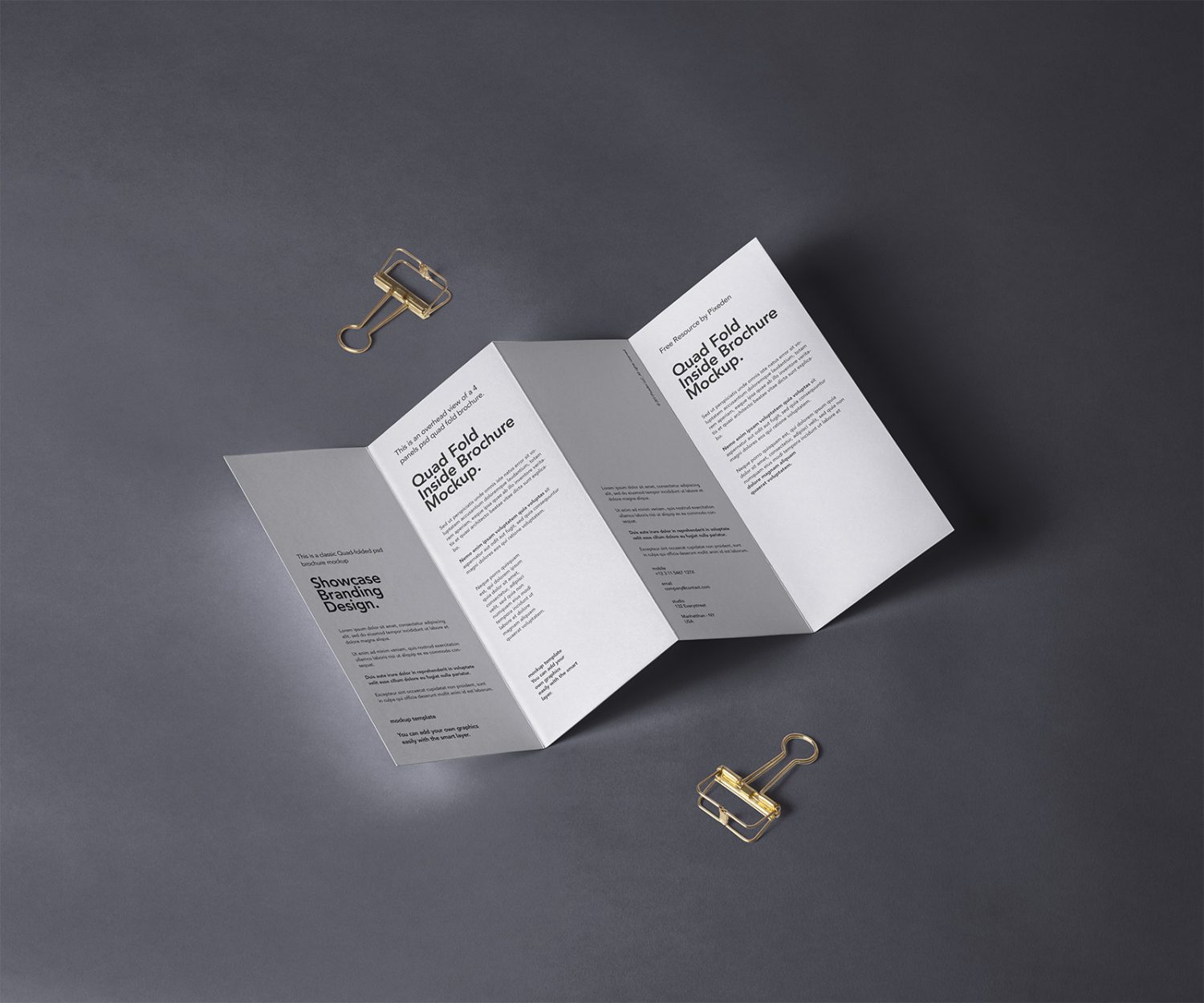 4 fold panel brochure PSD mockup to showcase your quad-fold psd brochure design in a photorealistic look. Add your work inside the smart object and enjoy it.