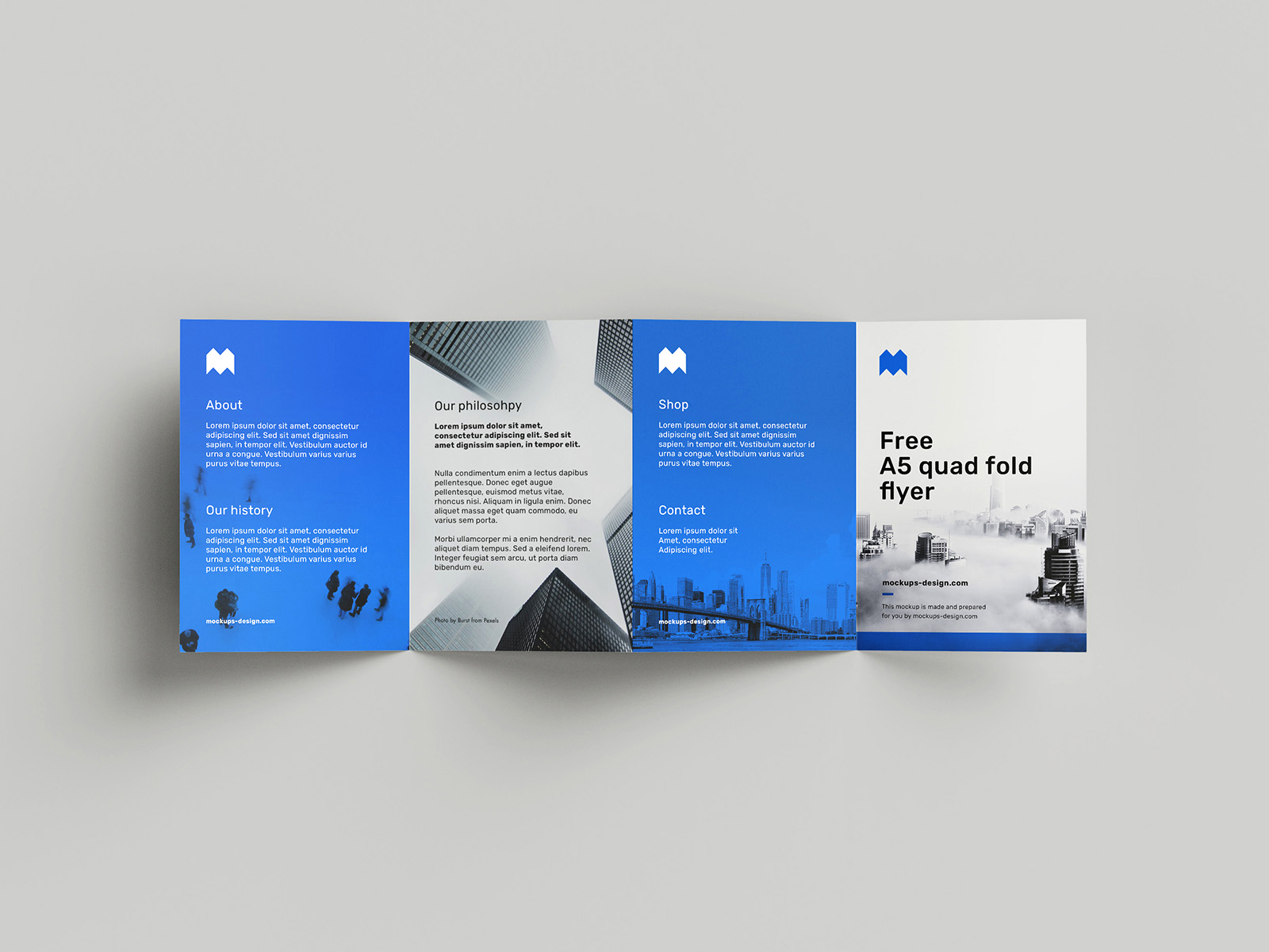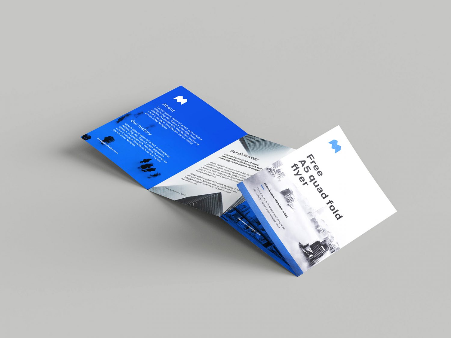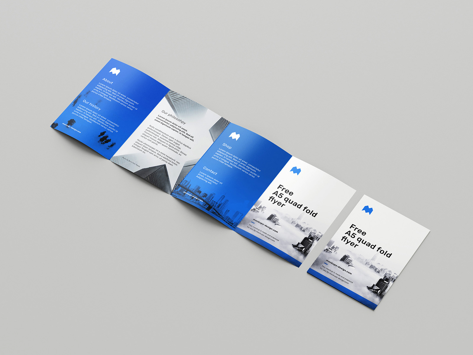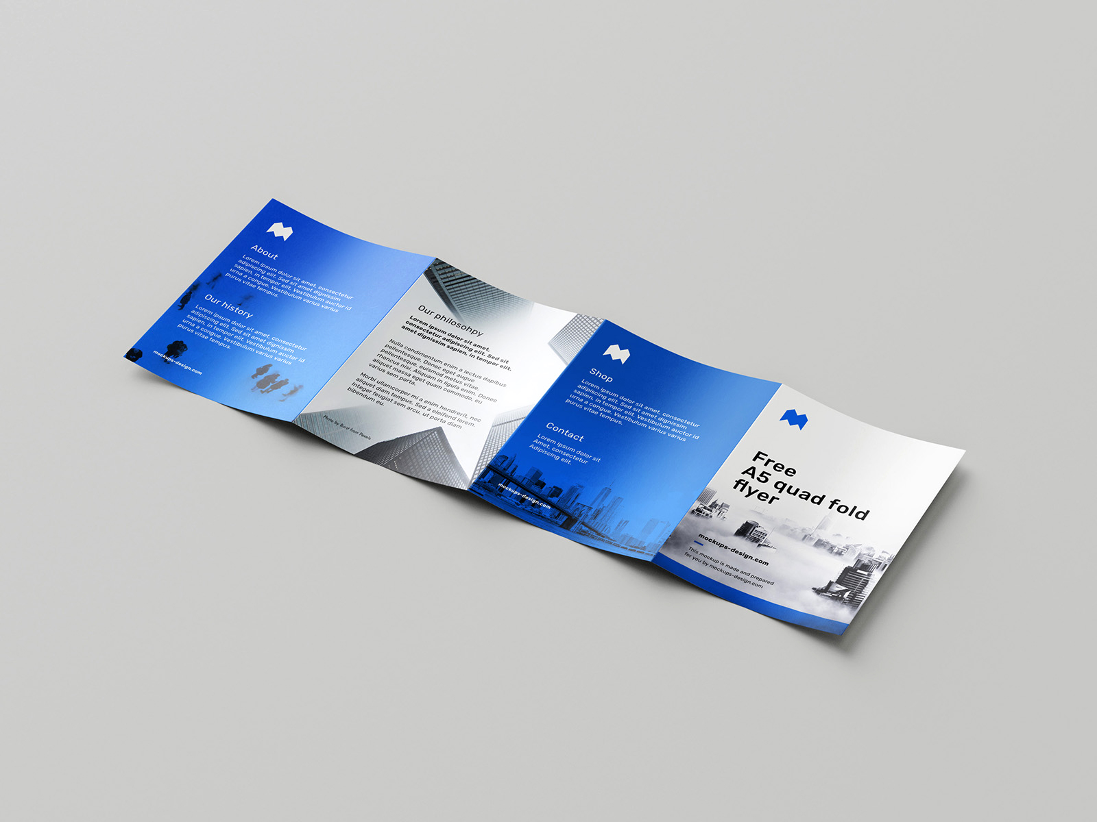 A5 Quad-Fold Flyer Free Mockup to showcase your quad-fold brochure branding design in a photorealistic style. Simple edit with smart layers. Free for personal and commercial use. Enjoy!