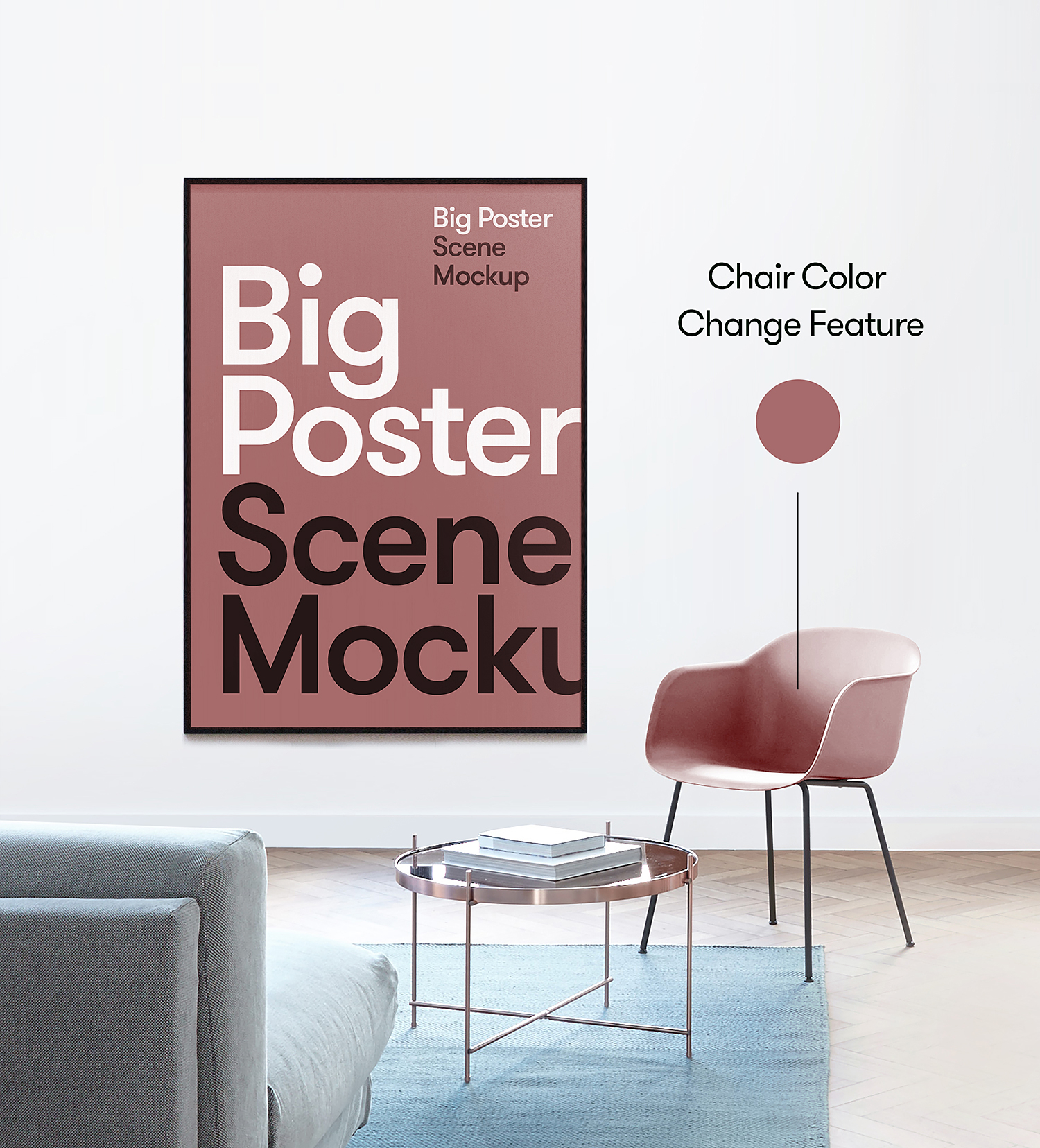 Free big poster scene mockup is clean PSD free mock-up in the indoor scene with a photo frame which you can use to showcase your artworks or designs. Make the scene more interesting by changing the chair color. Place your work inside the smart object and you will be done. Have fun!