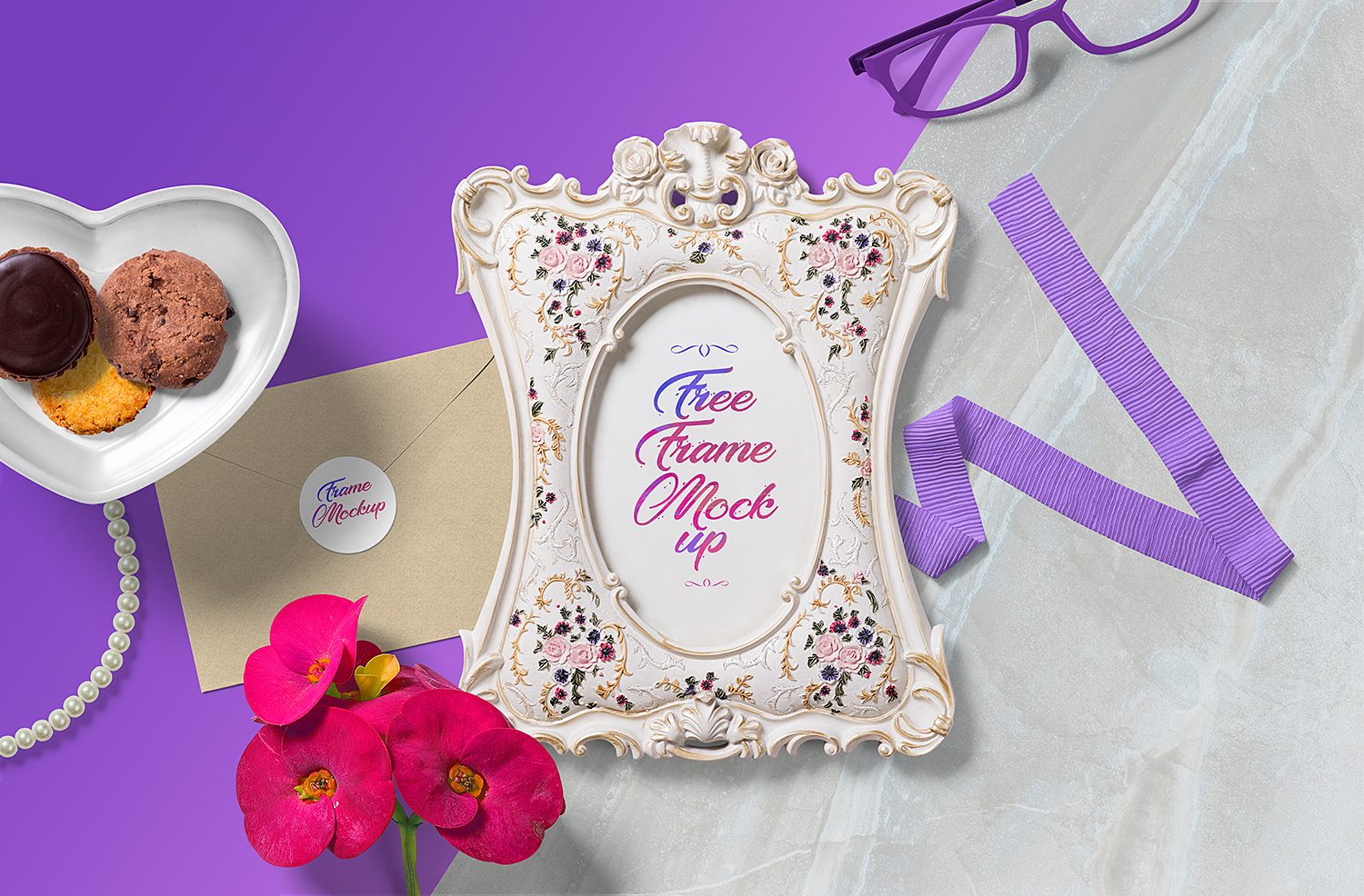 This gorgeous free picture frame mockup scene will help you to showcase your designs like never before. You can easily move or remove any of the items from this mockup scene to make hundreds of new compositions. Every item of this picture frame mockup scene is placed in separate folders to edit the colors, shadows and light effects of every single item separately. This free mockup scene offers photo frame, envelope, biscuit, heart-shaped plate, necklace, flower, ribbon, glasses, and fabric. You can use the smart object option to change the design of 3.5×5.5 inches photo frame and 2×2 inches envelope sticker. Use this mockup scene for giving your designs an eye-candy look.