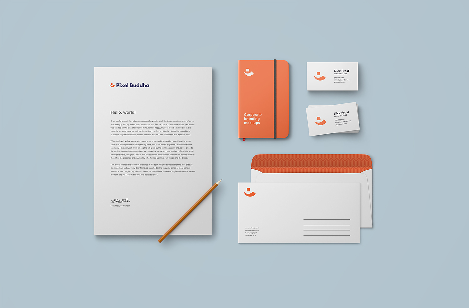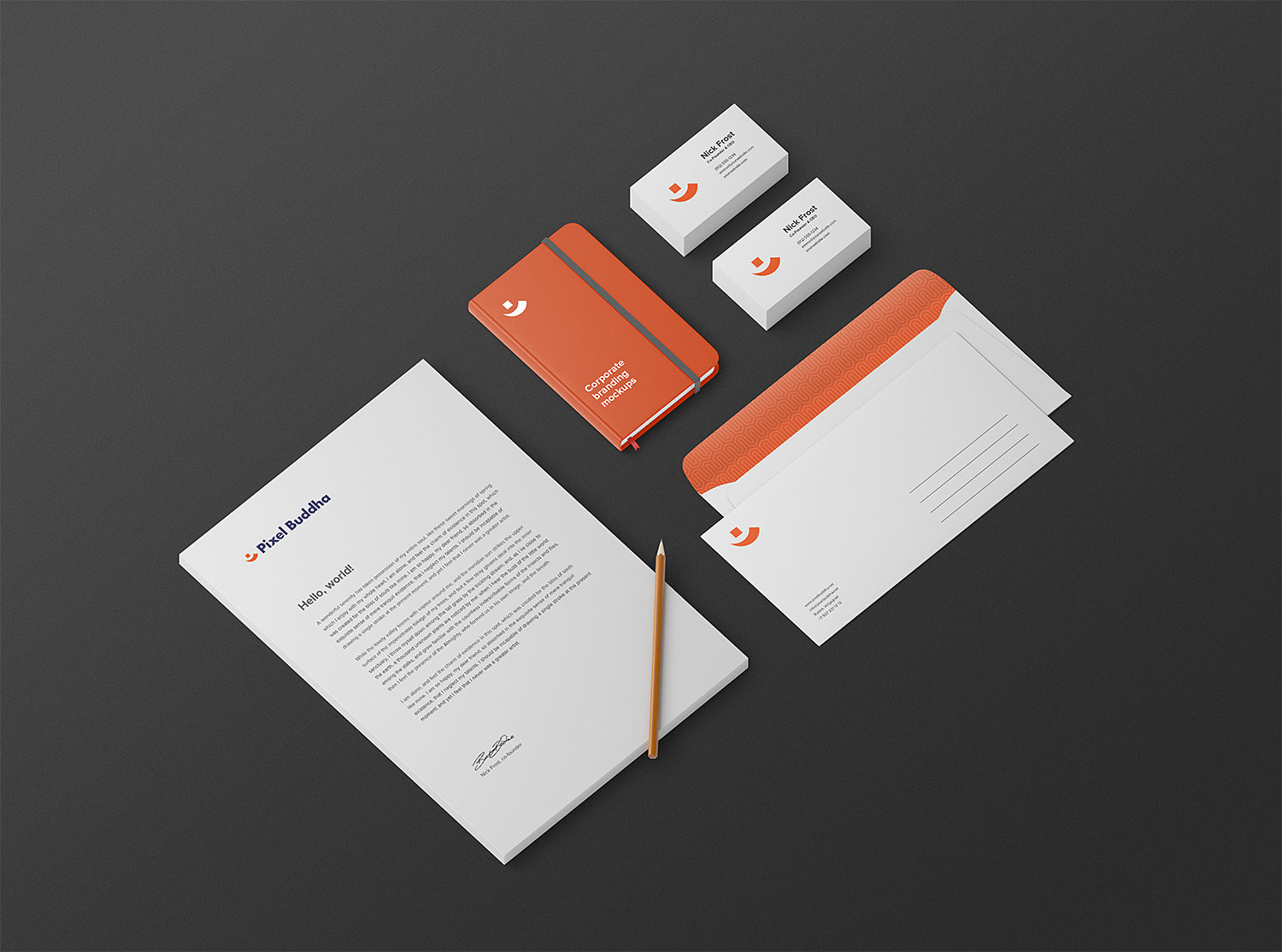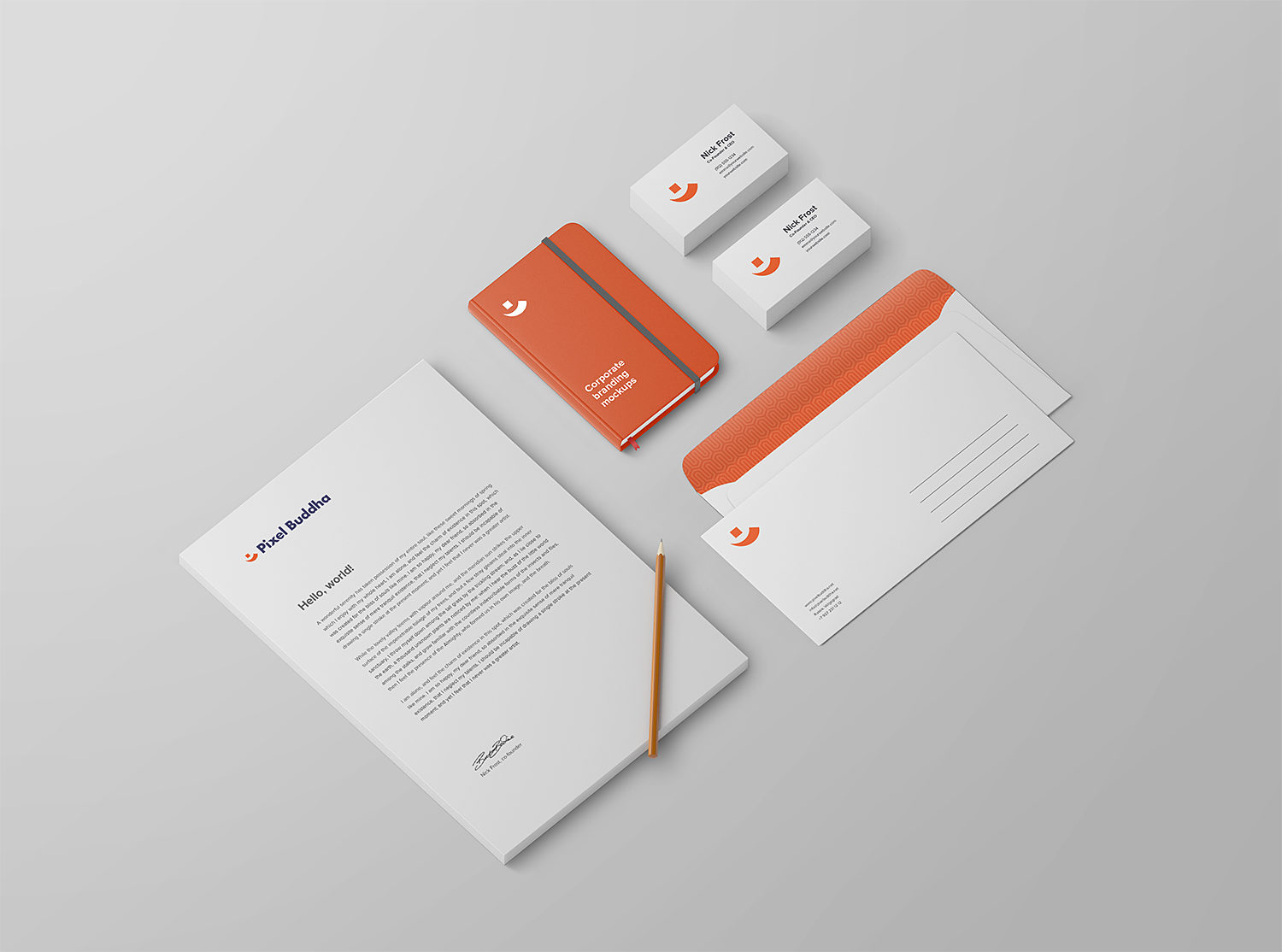 Free identity branding PSD mockup to present your stationery branding design in a professional way. The mockup includes 2 scenes, one in a top view and the other in perspective. You can add your design via smart layers, and also the items all movable which allow you to assemble your own scene. Both scenes include 2 business cards, a letterhead, a notebook, and an envelope along with a compliment sheet.